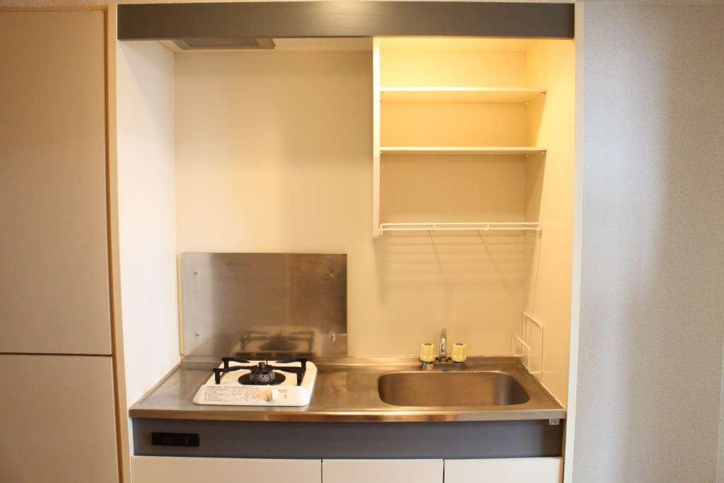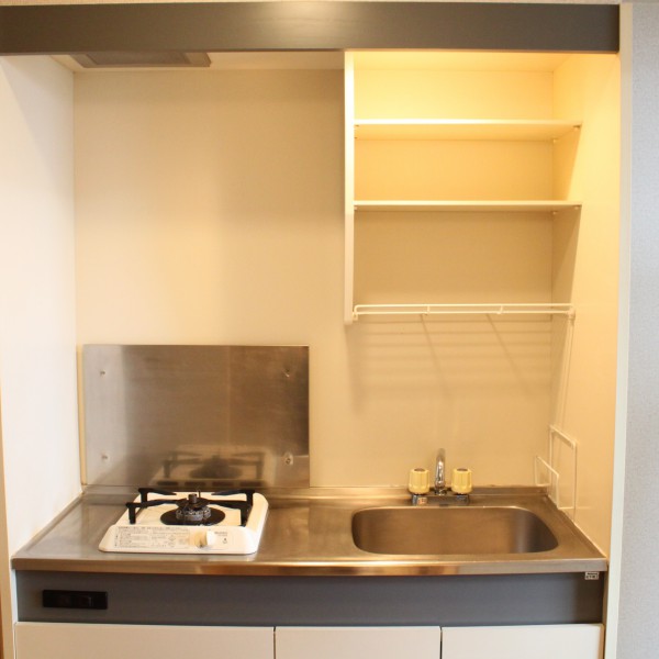 キッチンは嬉しいコンロ付き!流しの上には棚があり、お皿など収納できます。